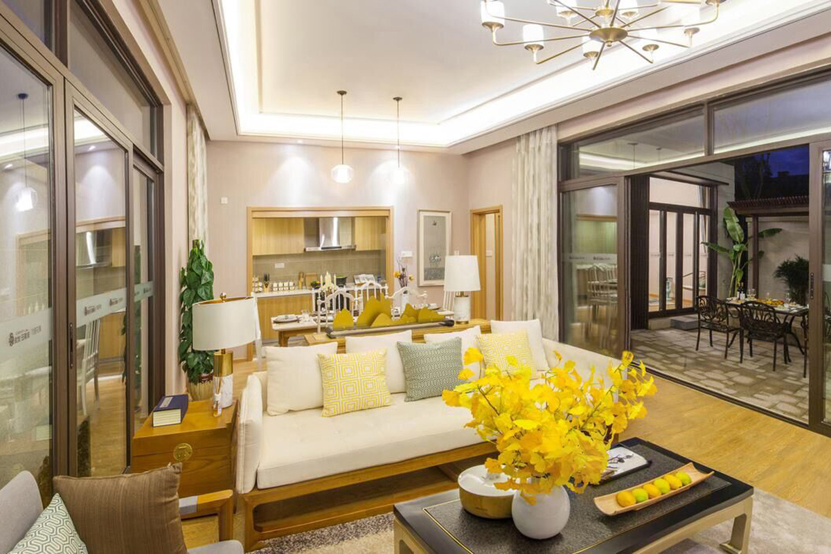 九韵花溪的独院别墅,采用了内向型围合庭院的布局形式,将庭院的私密性以及室内外空间的通融性做到了极致。
