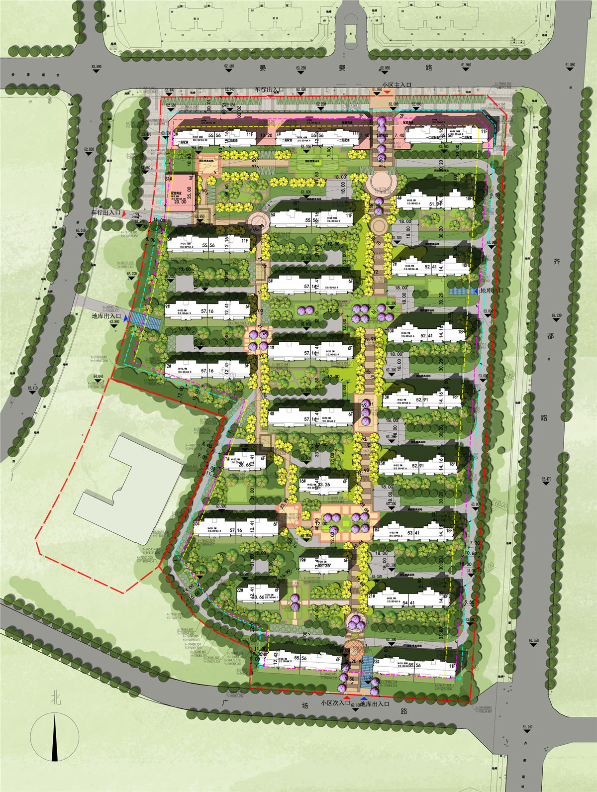 考虑本住区对城市空间形态及市政路的影响,规划设计打破传统住区封闭内向的属性,将城市公共空间与社区内部生活紧密联系起来,以开放的姿态面向市民,促进居民间的沟通和联系。住区内部拥有超长的景观轴线以及规整的中心景观绿地,打造舒适惬意的居住环境。