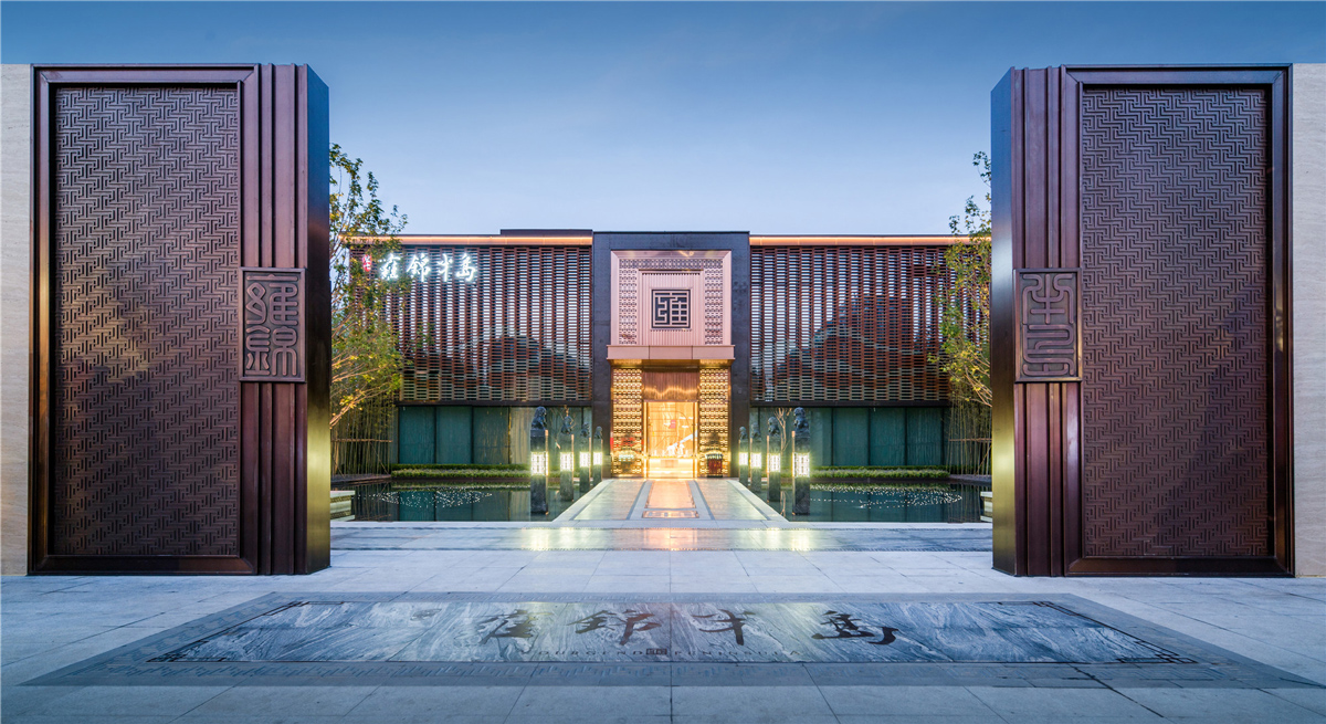 展示中心的门前的阵列拴马桩庄重而礼序,水景池底是两条鱼纹点灯,寓意鱼跃龙门,尊荣汇聚;从主入口辉弘的石韵青山进入较为尊崇的鱼跃秋池,带来归家礼仪感。