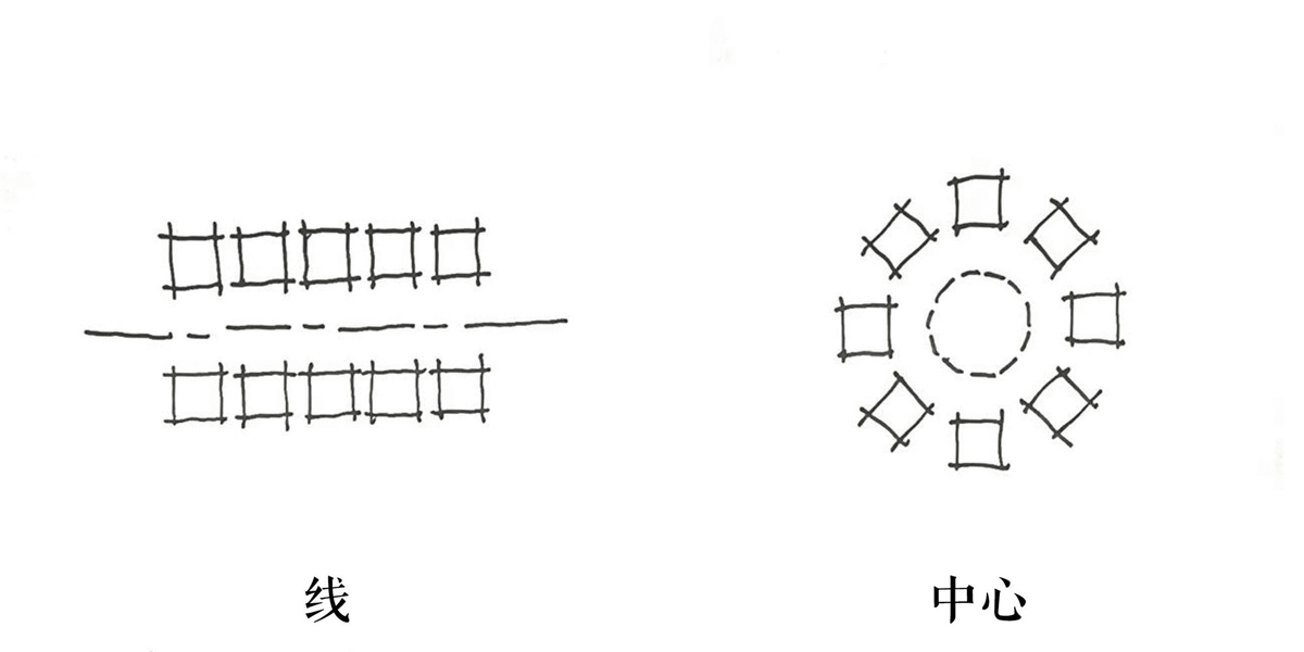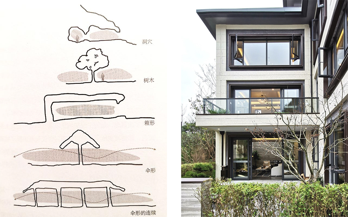 ▼ 东西方建筑起源:西方建筑以洞穴为原型,最终形成箱形建筑体量。东方建筑则与树木发生关系,形成伞状建筑形式。联排、合院建筑实际上是伞状形式的连续,柱子之间就是树干形成的空间。