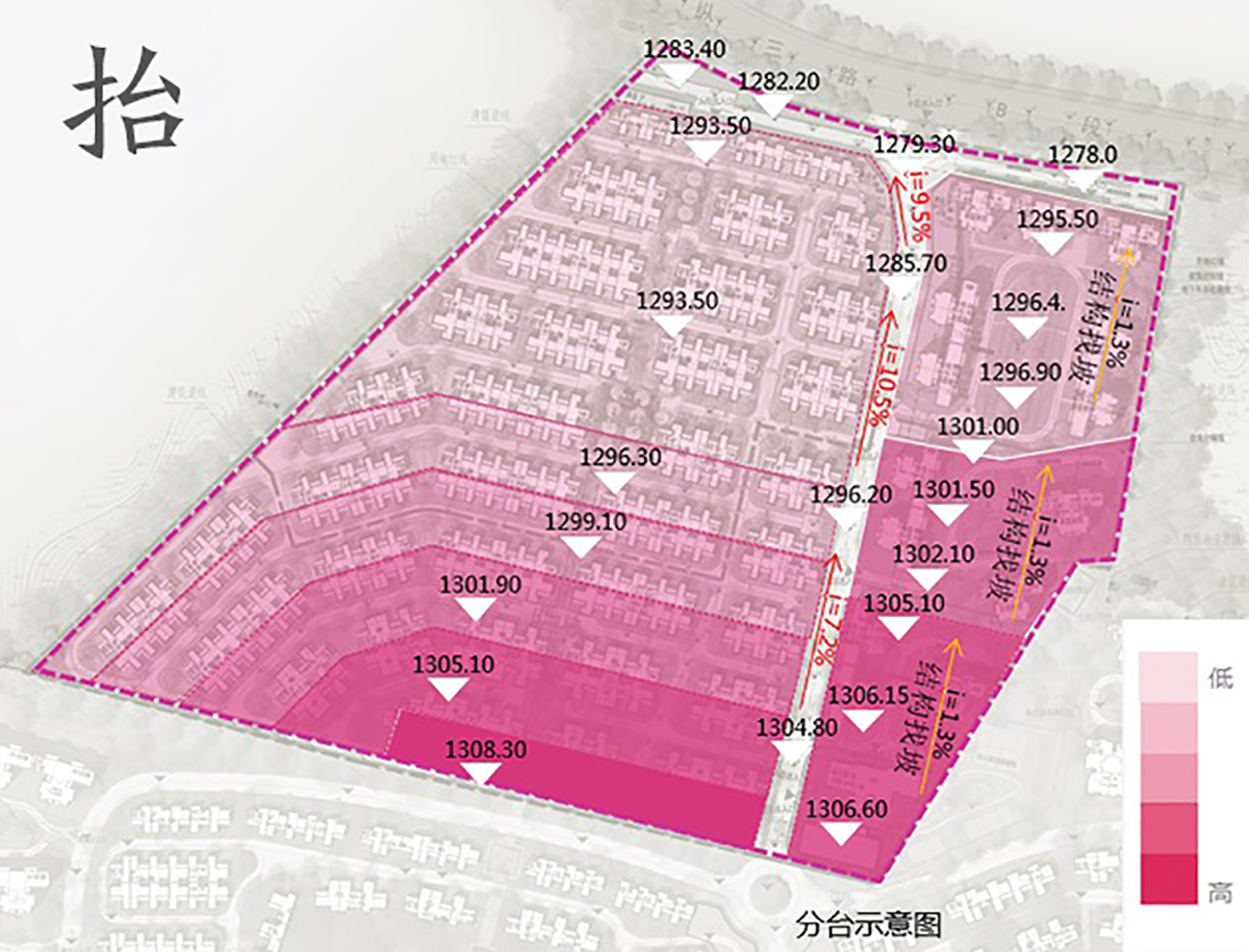 ▲“抬” 是指地形处理。地块南北向高差将近40m,建筑如何排布是我们地形处理的重点。通过对贵阳山地设计规范的解读,地块北侧与道路高差用两层底商来解决,后方设置了5级台地,分台线在两组别墅当中,形成背靠背的合院关系。
