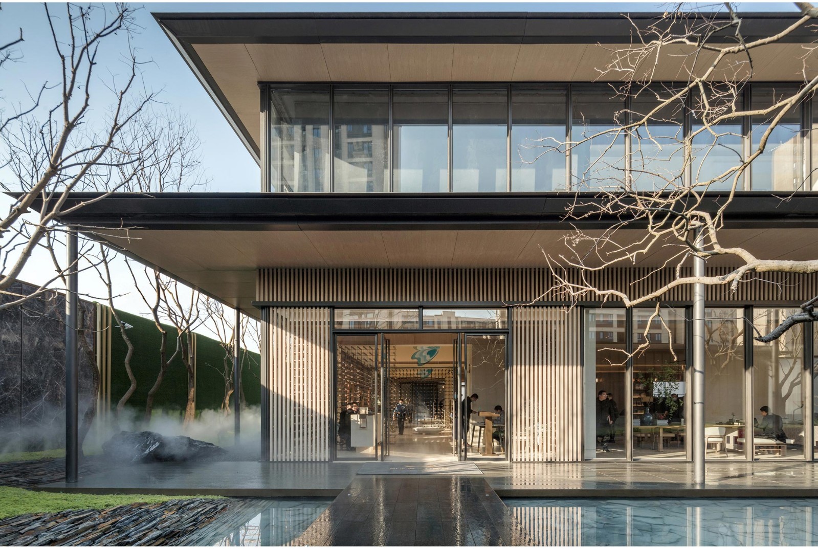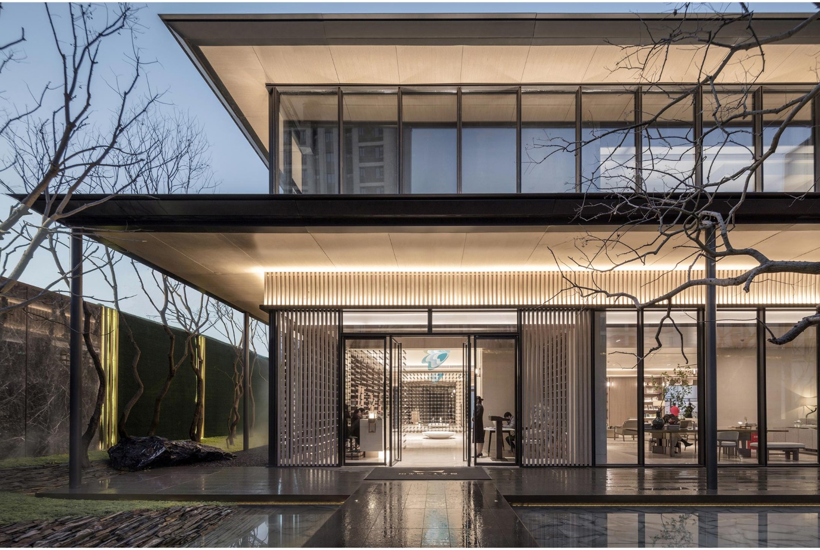 阳光城未来悦择址上海南滨江奉贤新城,项目距离地铁5 号线肖塘站1km,临近南桥环城路和沪杭公路,交通便利。设计秉承高端人居理念基因,融入精粹的前沿品质生活方式,以“摩登林居,都市谧境”为主题,基于独有的“高配”样本为依托,不断深研,将都荟的盛景融入居住的日常。示范区建筑形态呈现出错落的几何空间序列,呈现灵动,干净,简洁的现代式坡形屋顶建筑主体。建筑共三层,布局松弛有度,极简的线条,利落的转角,很好的与周边自然环境相融合。